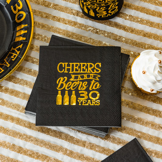 Crisky 30th Birthday Cocktail Napkins Black and Gold, Beverages Napkins for 30th Birthday Anniversary Decorations Cheers to 30 Years, 50 PCS, 3-Ply