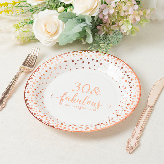 Crisky 30 Fabulous Disposable Plates for Women 30th Birthday Decorations Rose Gold Dessert, Buffet, Cake, Lunch, Dinner Disposable Plates 30th Birthday Party Table Supples, 50 Count, 9 inches