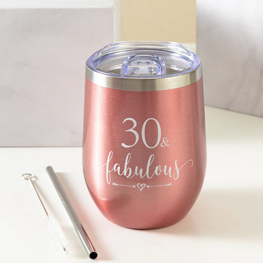 Crisky Rose Gold 30 & Fabulous Wine Tumbler for Women 30th Birthday Gifts for Women, Wife, Mom, Sister, Aunt, Friends, Coworker Her, Vacuum Insulated Coffee Cup,12oz with Box, Lid, Straw