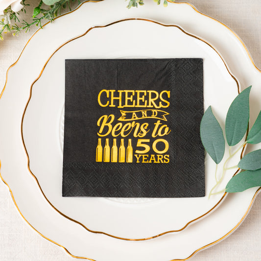 Crisky 50th Birthday Cocktail Napkins Black and Gold, Beverages Napkins for 50th Birthday Anniversary Decorations Cheers and Beers to 50 Years, 50 PCS, 3-Ply