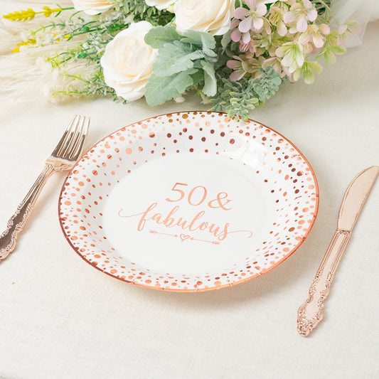 Crisky 50 Fabulous Disposable Plates for Women 50th Birthday Decorations Rose Gold Dessert, Buffet, Cake, Lunch, Dinner Disposable Plates 50th Birthday Party Table Supples, 50 Count, 9 inches