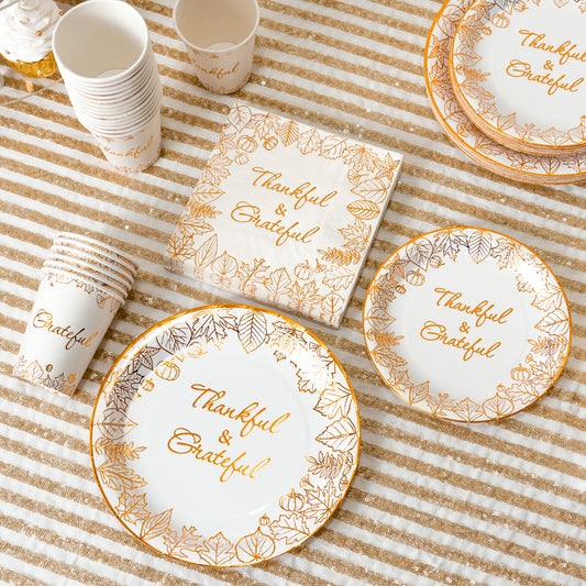 Crisky Thanksgiving Disposable Napkins Plates Cups Set for Autumn Thanksgiving Dinner Party Decorations, Thankful and Grateful in Orange Foil, Set of 24