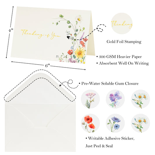 Crisky 25 Pack Wildflower Gold Foil Thinking of You Greeting Cards with Envelopes Boxed 4 Assortment Encouragement Cards to Send to Close Friends, Relative or Loved Ones