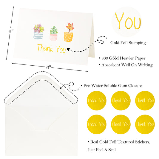 Crisky 4x6 Succulent 2 Assorted Thank You Cards with Envelopes (50 Pack) & Stickers Greeting Notes Bulk, greenery plants for Birthday, Baby Shower,Bridal Shower, Wedding, Graduation