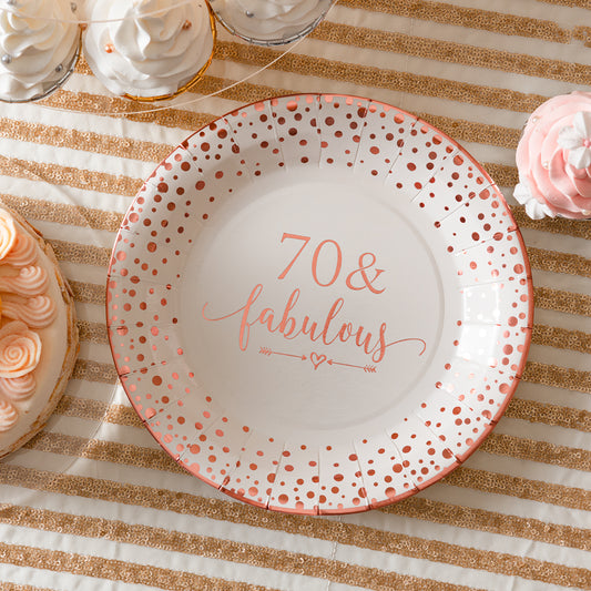 Crisky 70 Fabulous Disposable Plates for Women 70th Birthday Decorations Rose Gold Dessert, Buffet, Cake, Lunch, Dinner Disposable Plates 70th Birthday Party Table Supples, 50 Count, 9 inches