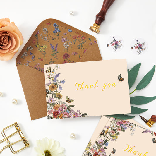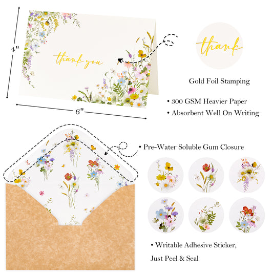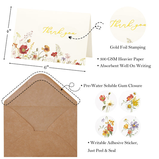 Crisky Gold Foil Wildflower Thank Cards with Envelopes 50 Pack bulk 4x6 Inch Kraft envelopes Flower Greeting Cards with Envelopes For Baby Shower, Wedding, Bridal Shower, Graduation