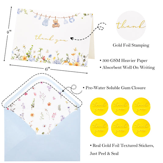 Crisky Baby Shower Blue Gold Thank You Cards (50 Pack) with Envelopes & Stickers Boy Baby Shower Greeting Cards Bulk, Watercolor Delicate Wildflower for Baby Shower Party