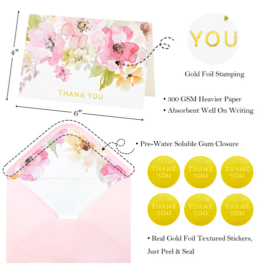 Crisky Watercolor Flower 4 Assorted Gold Foil Thank You Cards (50 Pack) with Envelopes & Stickers Printable Greeting Cards Bulk for Birthday, Baby Shower, Bridal Shower, Wedding, All Occasion