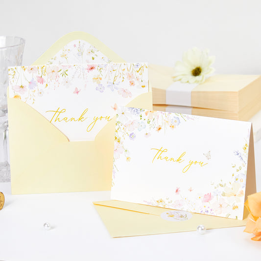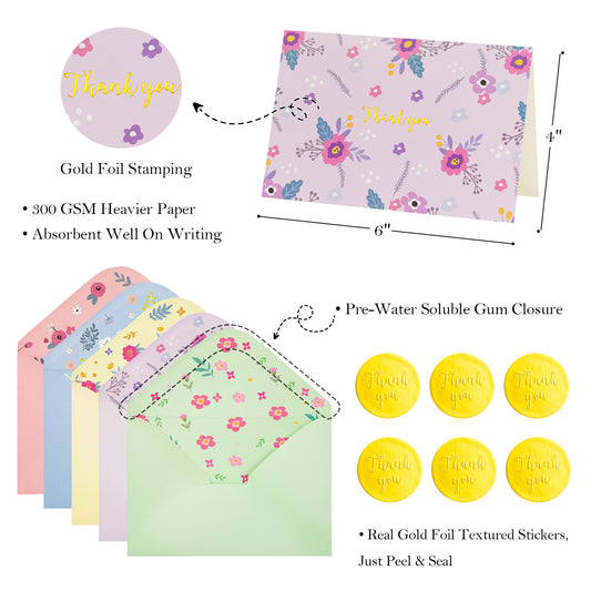 Crisky 4 Assorted Gold Foil WildFlowers Thank You Cards, (50 Cards with Envelopes for Birthday, Baby Shower, Bridal Shower, Wedding, All Occasion)