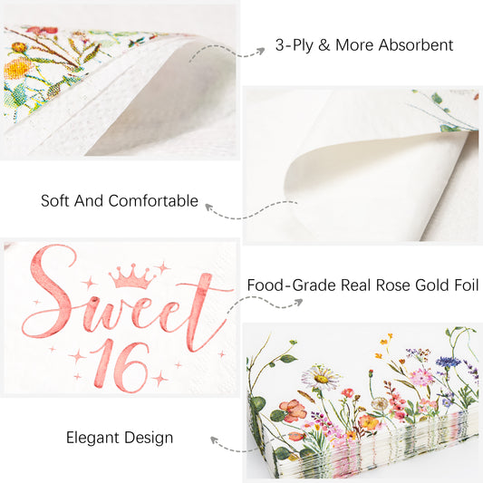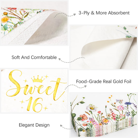 Crisky Floral Gold Sweet 16 Birthday Napkins - Gold Foil Paper Disposable Napkins for Girl's 16th Birthday Party Decoration, 3-Ply, 50 Counts