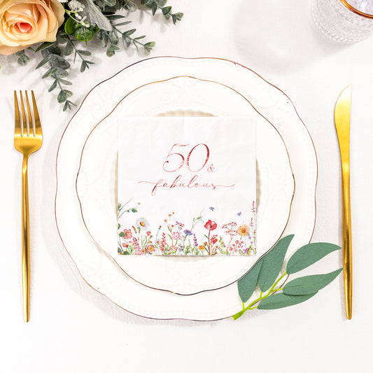 Crisky 50th Birthday Napkins for Women Rose Gold Foil 50 Fabulous Paper Disposable Napkins for Anniversary/50th Birthday Party Decoration, 3-Ply, 50 Counts