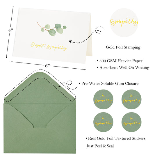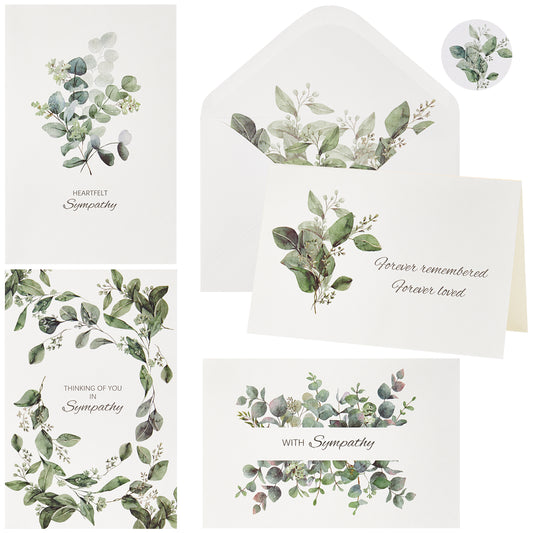 Crisky 4 Pack Greenery Eucalyptus Sympathy Cards with Envelopes sealed 4 Assortment Condolence/Bereavement Cards