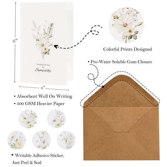 Crisky 25 Pack Watercolor White WildFlower Sympathy Cards with Envelopes Boxed 4 Assortment Condolence/Bereavement Cards