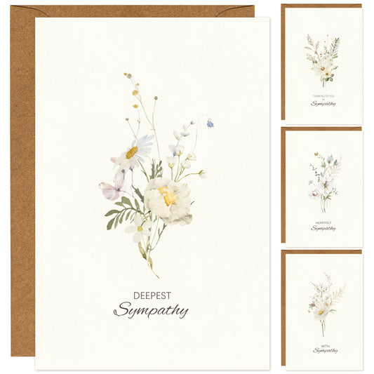 Crisky 4 Pack Watercolor White WildFlower Sympathy Cards with Envelopes Sealed 4 Assortment Condolence/Bereavement Cards