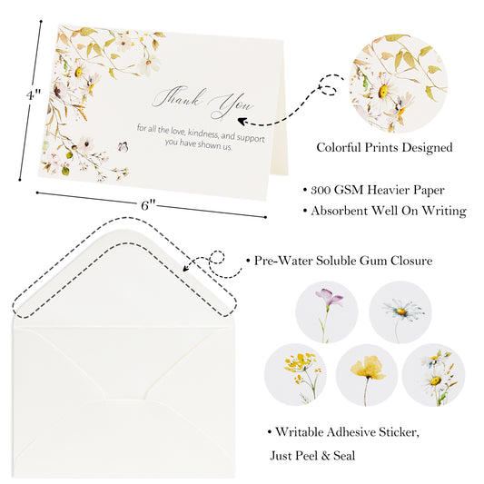 Crisky 50 Pack Funeral Thank You Cards with Envelopes, Stickers & Message Inside Watercolor Wildflowers Bereavement Sympathy Cards for Funeral Family Friends Boxed 5 Assortment