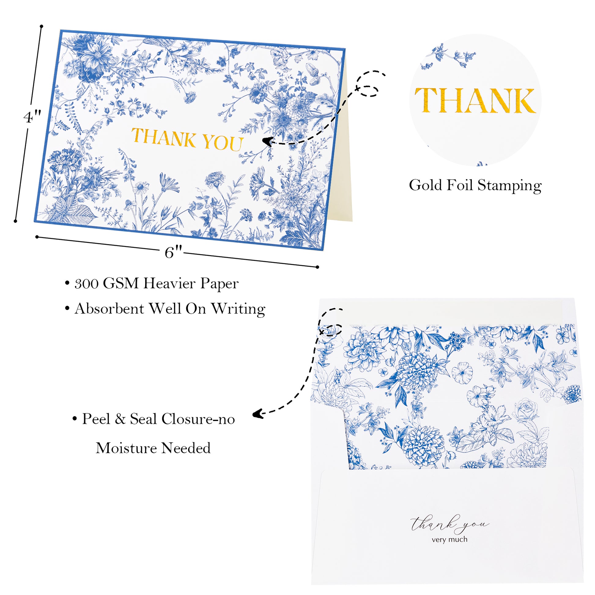 Crisky 50 Pack Blue Floral Thank You Cards Gold Foil Greeting Notes Bulk with Envelopes & Stickers for Birthday, Baby Shower, Bridal Shower, Wedding, Graduation, Business