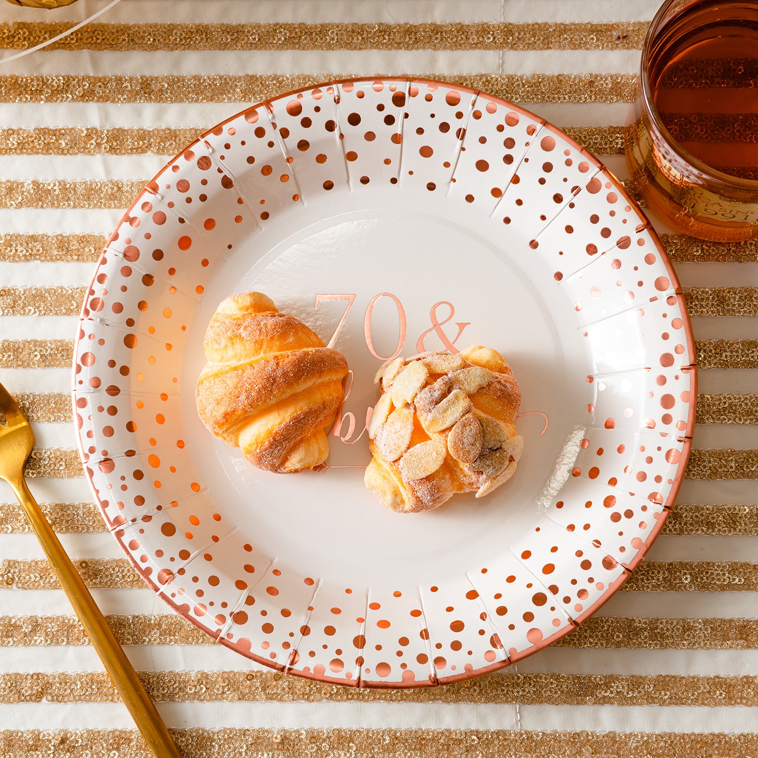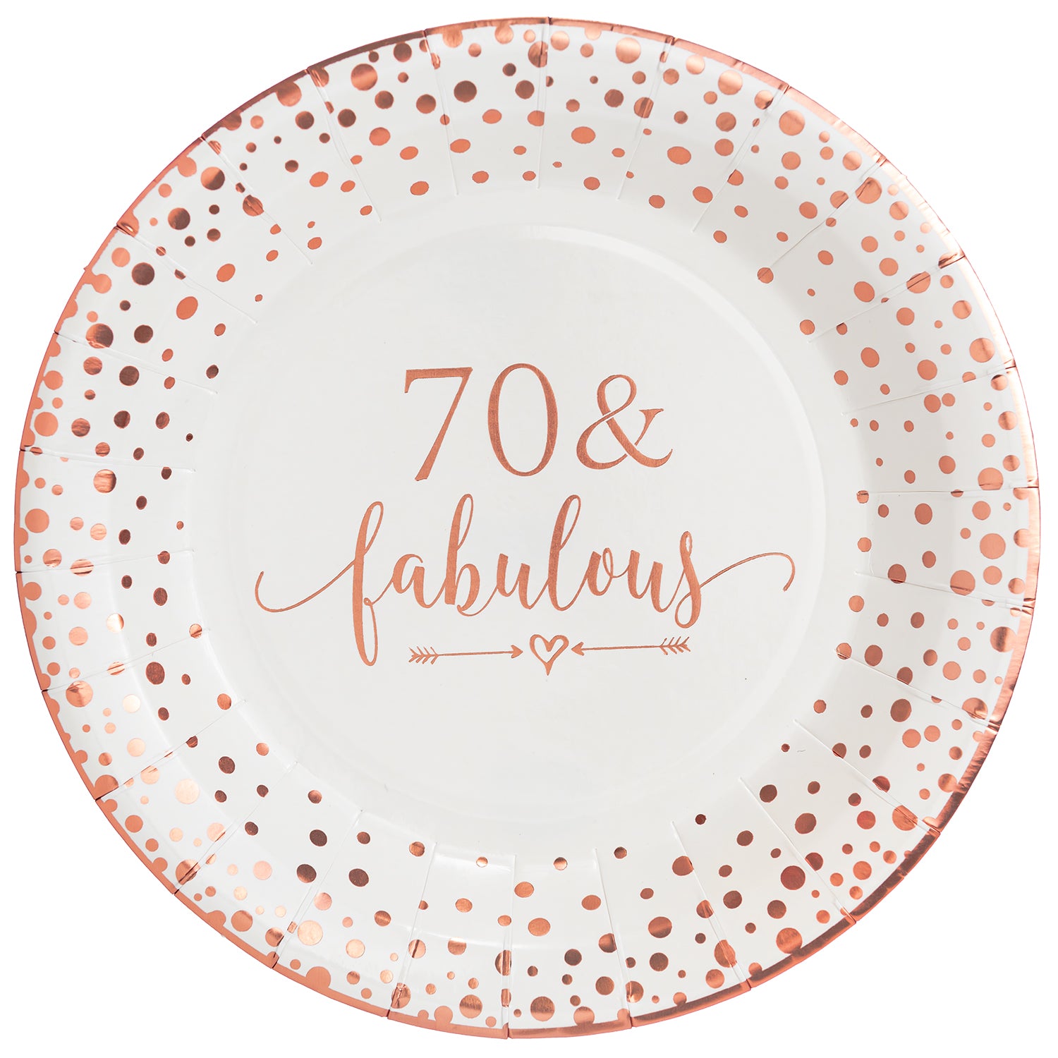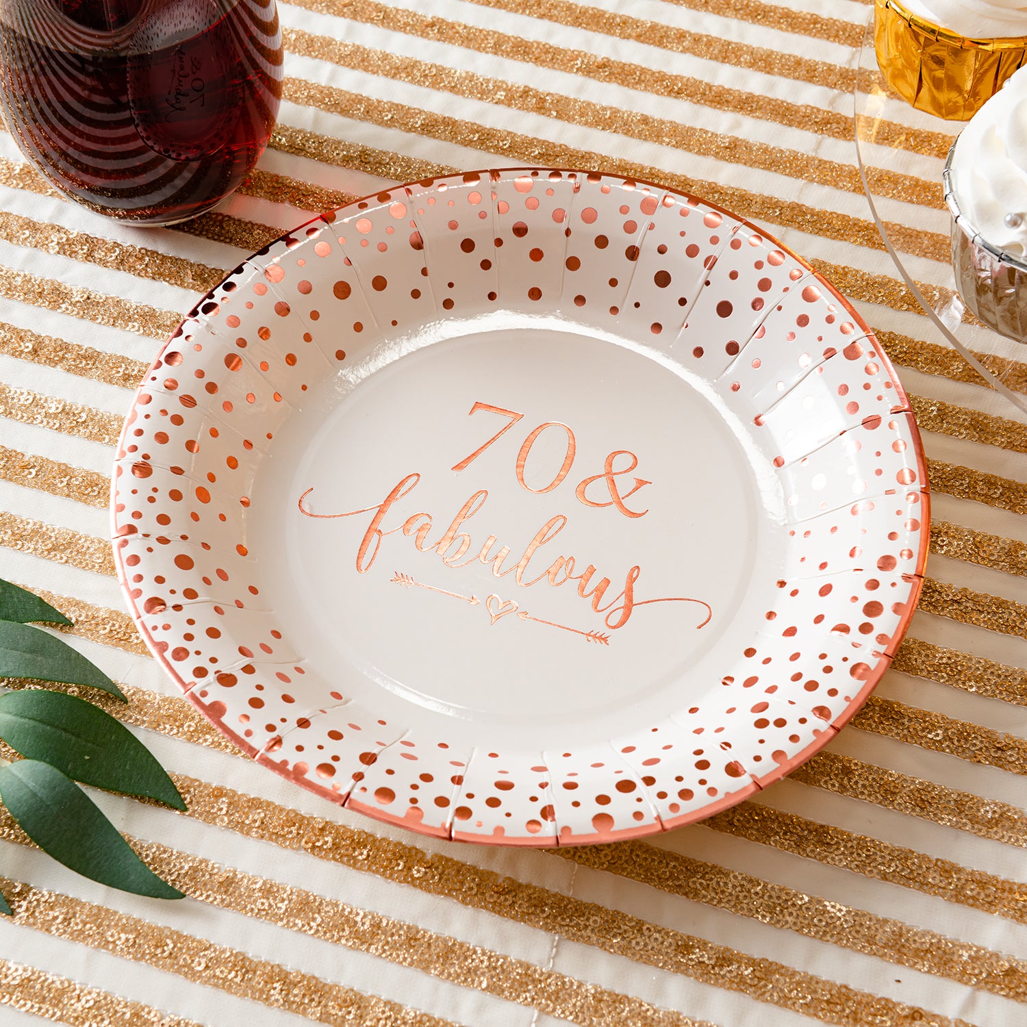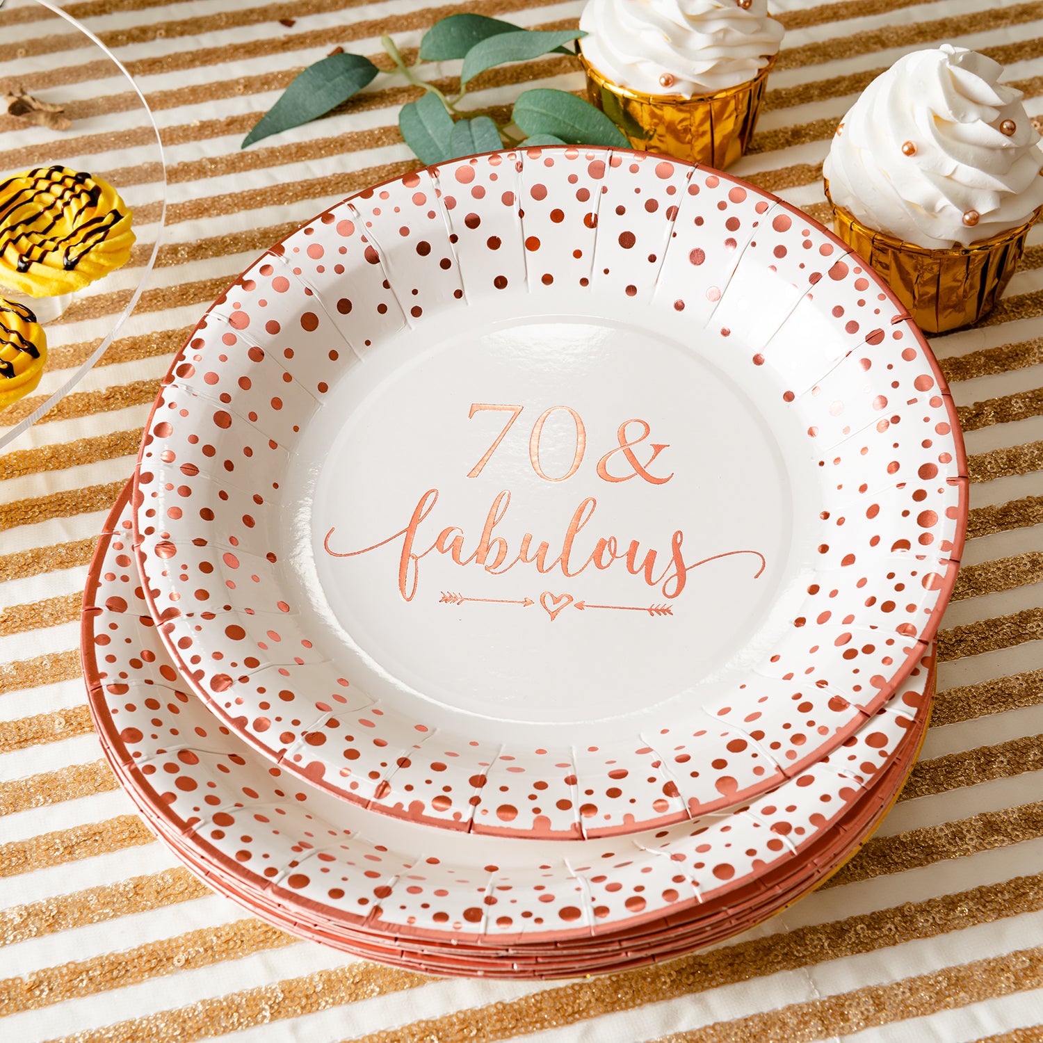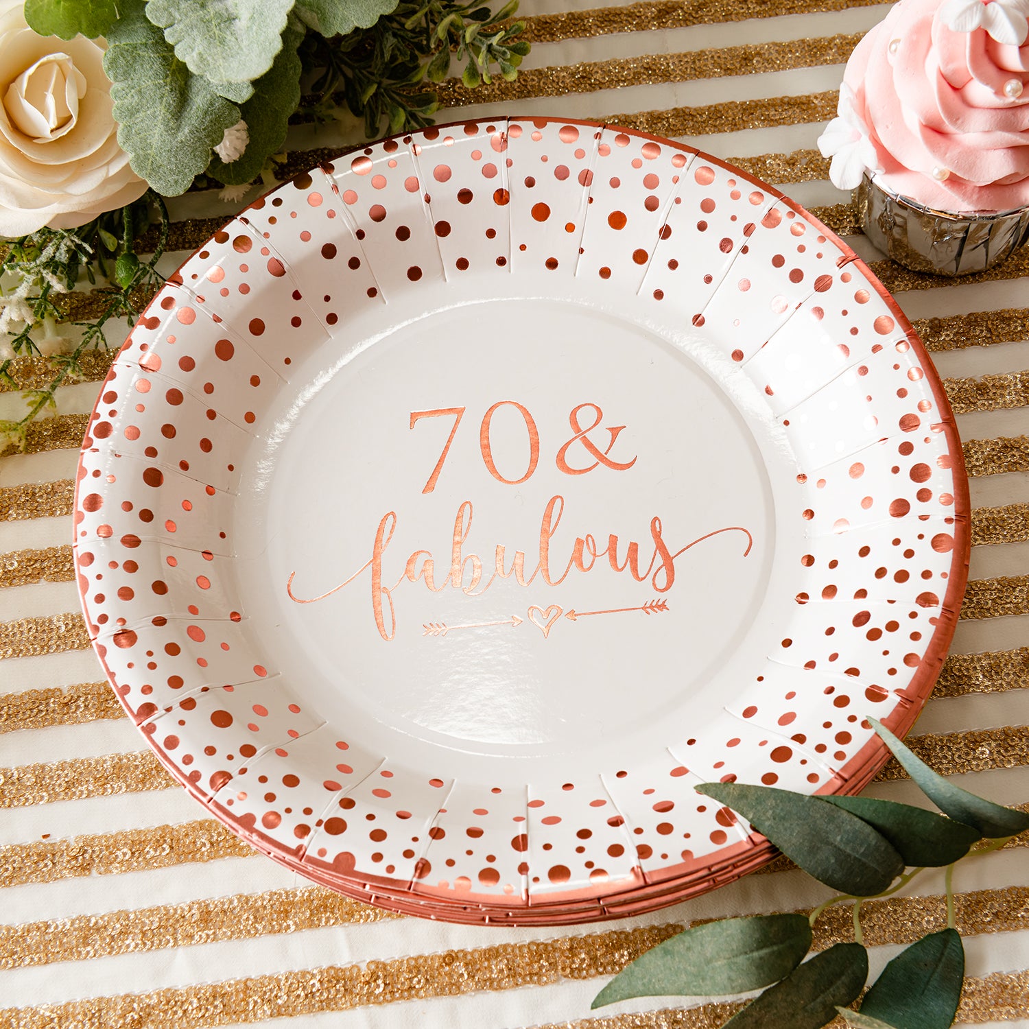 - ONE SET INCLUDES: 50 pcs 9 inches disposable plates. Rose Gold foil stamp "70 and fabulous" features the women 70th birthday party theme, perfect rose gold 70th birthday decorations